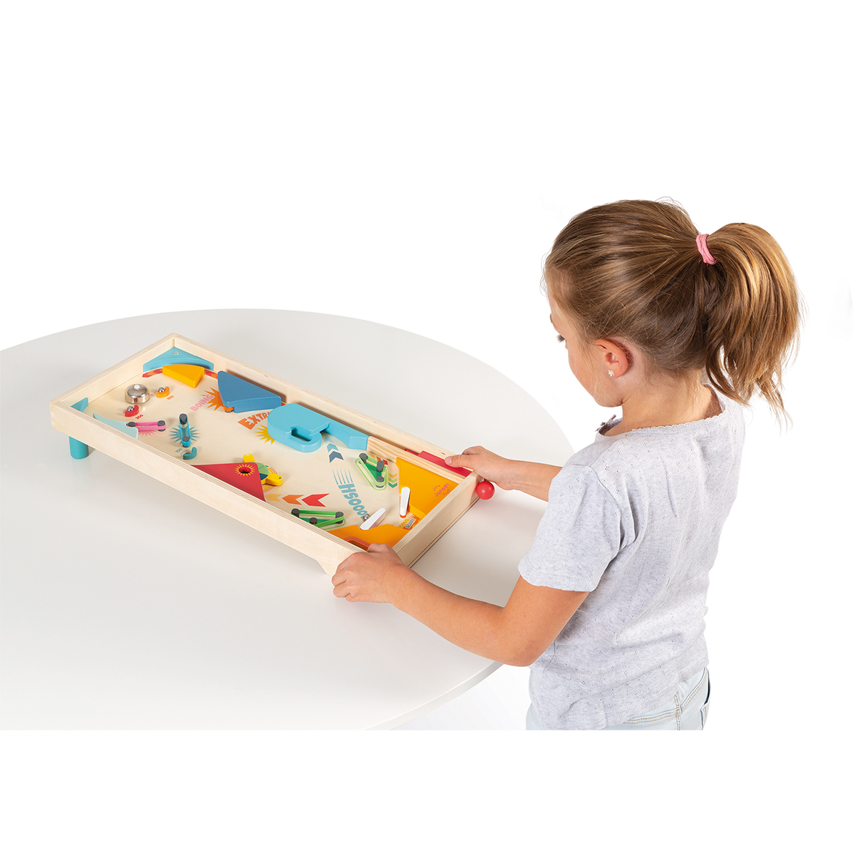 Magnifique flipper en bois, haut en couleur pour développer concentration et vivacité! Lance la bille en métal pour faire sonner la cloche et accumuler des points en passant par la roulette et en rebondissant sur les bandes élastiques. Livré avec 3 billes en métal. Jouet en bois pour enfants de 5 ans et plus.