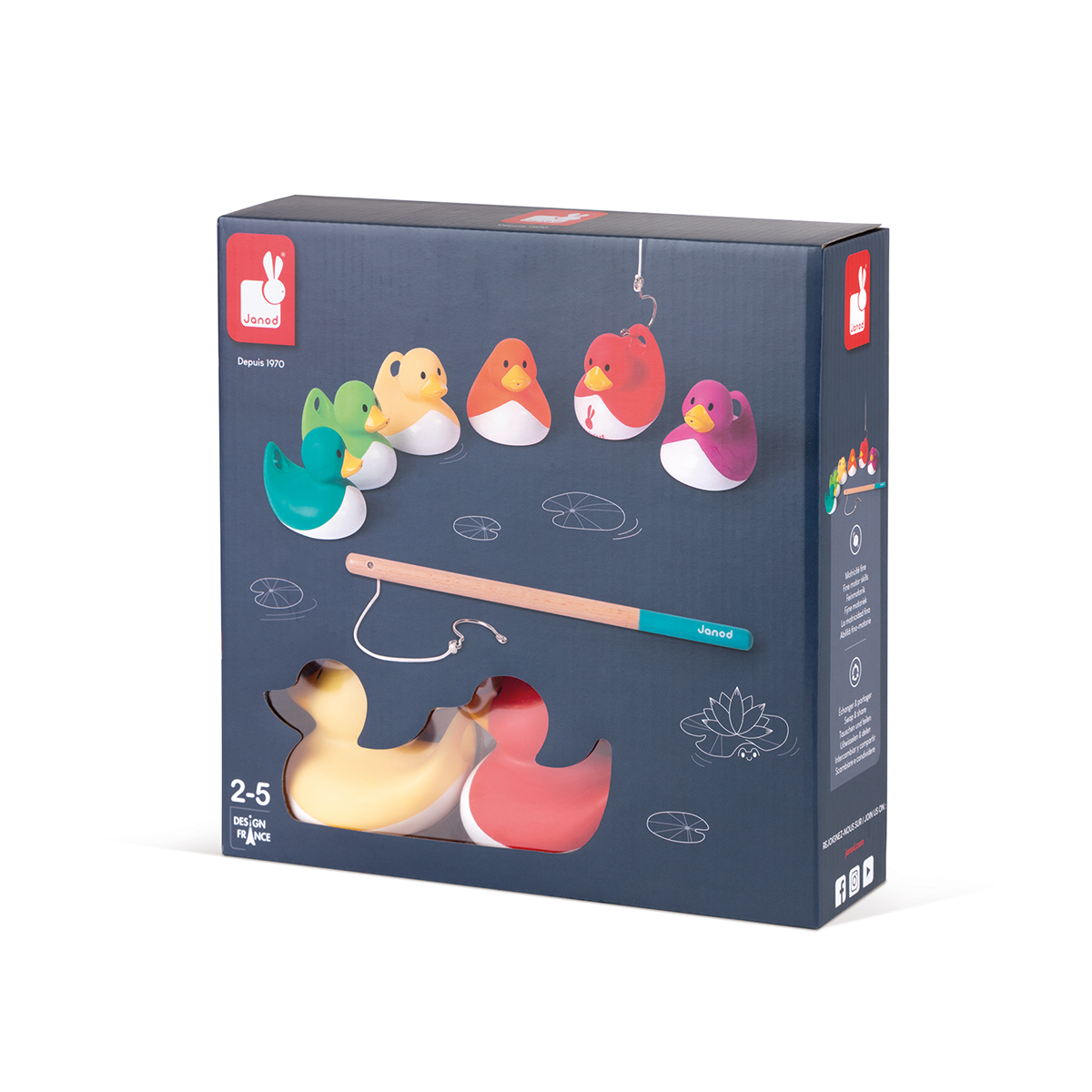 Jeu de pêche, jouet de bain, idéal pour animer également une fête d'anniversaire entre copains. Vendus dans une sacoche pour un rangement ultra pratique. Jouets en plastique et cannes en bois massif. Canards 8x6.5cx7cm, cannes 30x1.5cm
