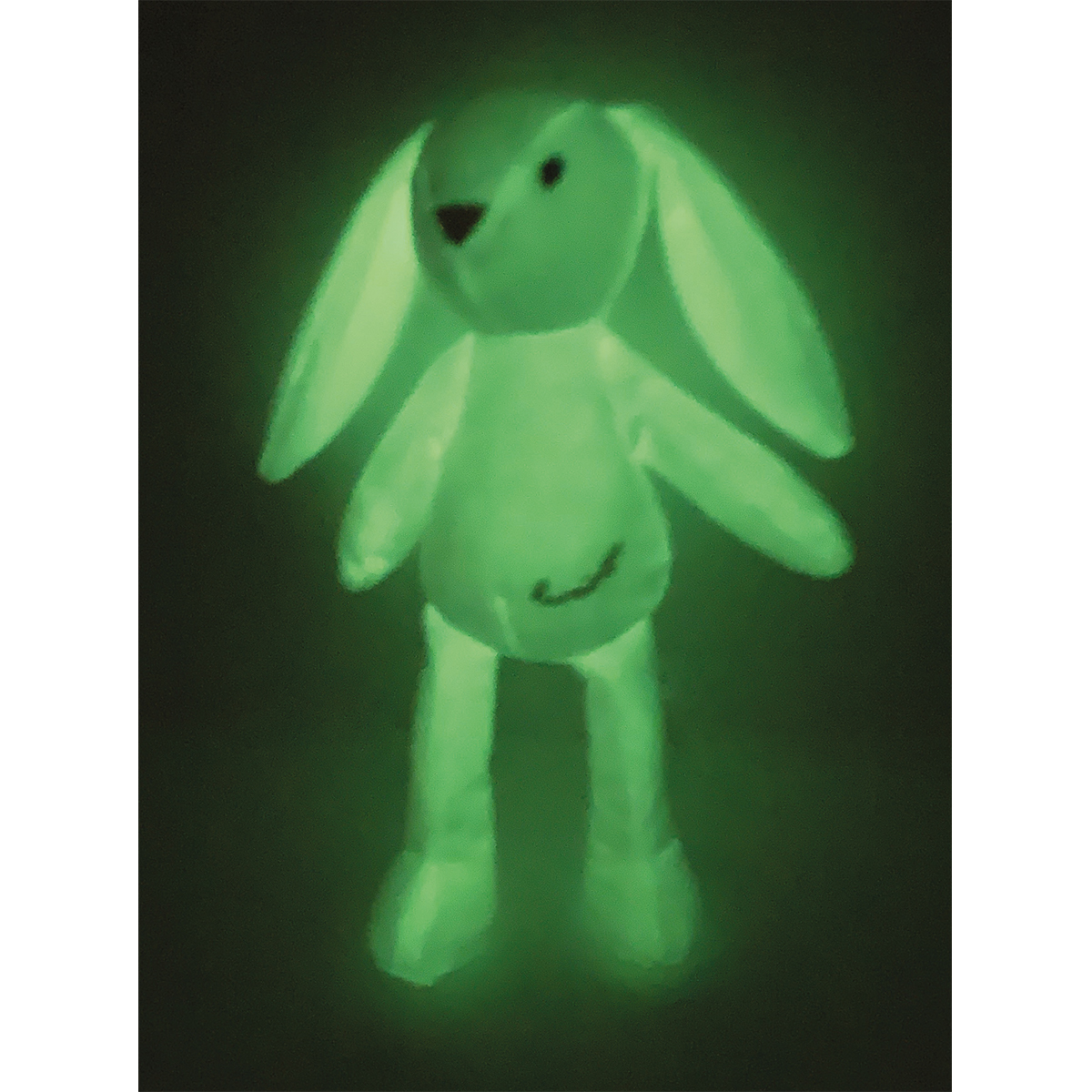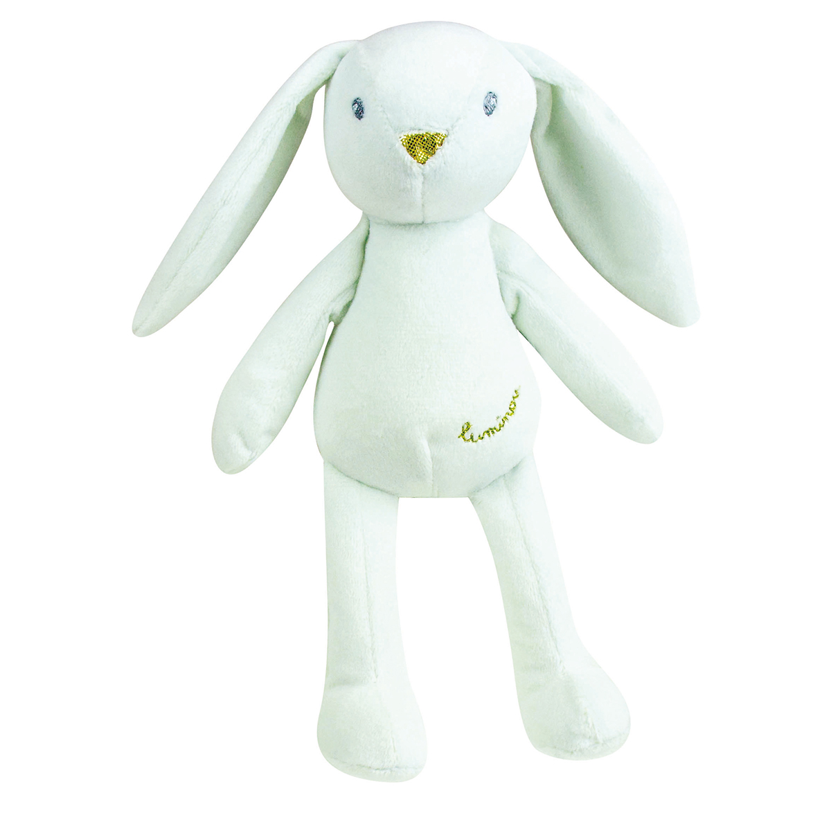 Peluches pensées pour les bébés qui s'illuminent dans le noir et s'éteignent doucement, grâce à leur tissu photoluminescent. Assortiment : 6 Blanc / 3 Pêche / 3 Bleu
