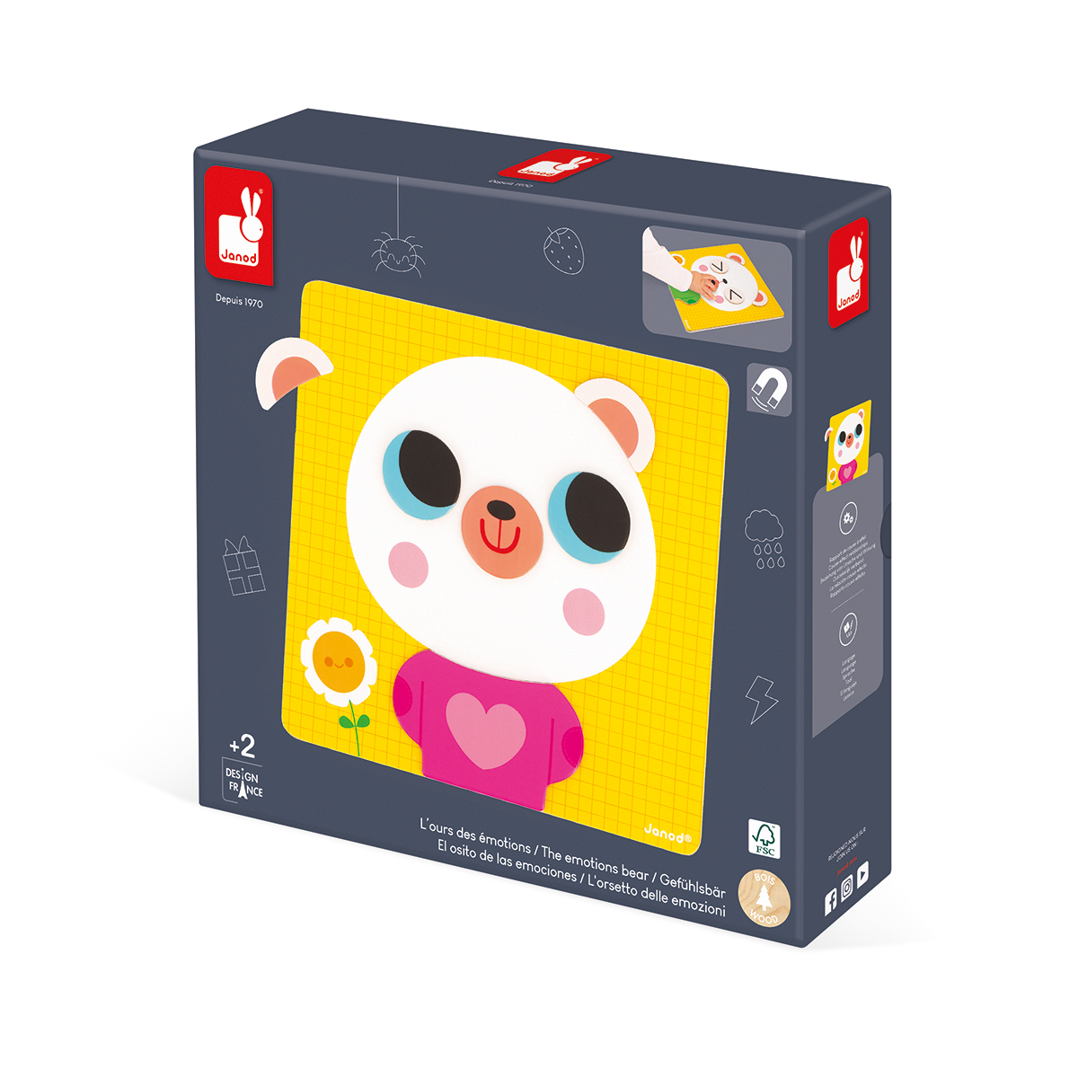 Ce matin Teddy est tout grognon, mais que se passe-t-il ? Pour un enfant, les sentiments peuvent être complexes à exprimer. Grâce à ce jouet, votre enfant apprendra à identifier 7 émotions (joie, amour, colère..) qu’il pourra reproduire avec les cartes. Il pourra alors les nommer et les exprimer. Parfait pour accompagner parents et enfants à mieux s’exprimer et développer le langage à travers un jouet ludique et éducatif. Contient un plateau en bois et ses 30 magnets, ainsi que 7 cartes modèles. Jouet magnétique en boispour les enfants à partir de 2 ans.