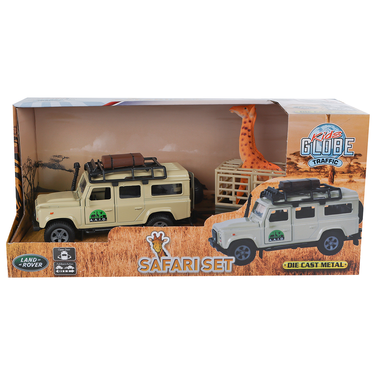Landrover Defender avec remorque et girafe. Avec ce véhicule tu es bien prét pour ton safari.