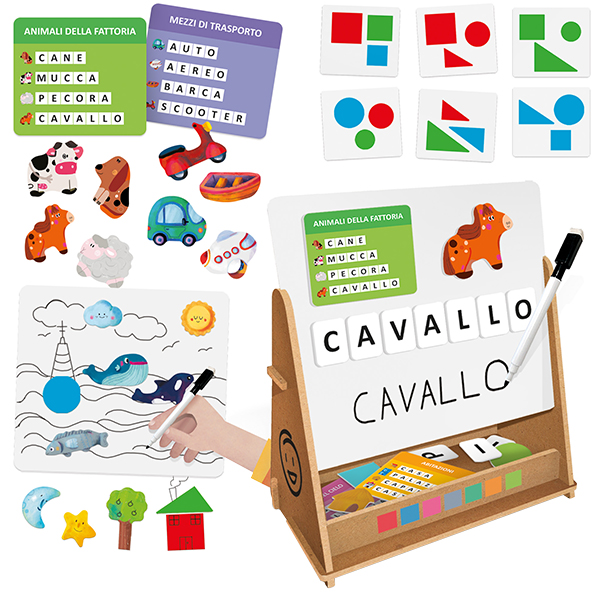 Un riche kit de matériel pédagogique et 100 aimants pour apprendre de nombreux nouveaux mots, formes et couleurs. Avec le tableau magnétique spécial et en bois, vous pouvez apprendre à écrire et à lire de manière originale et amusante.