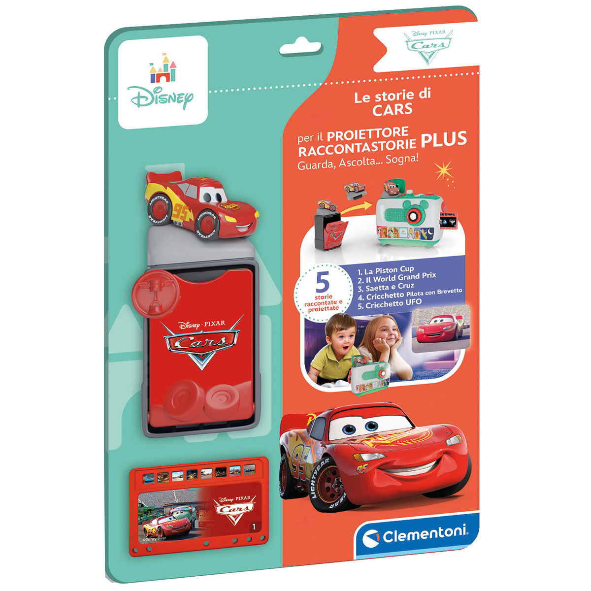 Una scatola con storie aggiuntive per il proiettore Disney PLUS. Contiene 5 schede con storie divertenti e una piccola statuina da agganciare al proiettore per godersi i contenuti aggiuntivi. Ogni scheda proietta 8 diapositive con immagini originali dei cartoni animati Disney. Una volta ascoltata la storia, riponi la scheda nell'apposita scatolina, cambia personaggio e ricomincia. Colleziona tutti i personaggi!