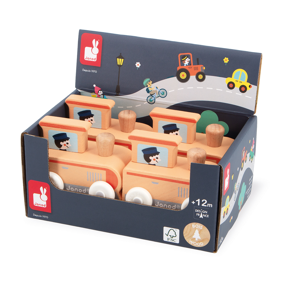 TCHOU - TCHOU ! C'est parti pour le grand voyage à bord du train. Imaginez un beau et grand voyage avec la locomotive en bois. Grâce à sa forme la locomotive est facile à prendre ne main pour les tout petits. Jouet en bois FSCTM, pour les enfants à partir de 12 mois. Associé à ton tapis et au joli coffret de cube de la gamme Janod, ce roulant complète parfaitement ton univers.