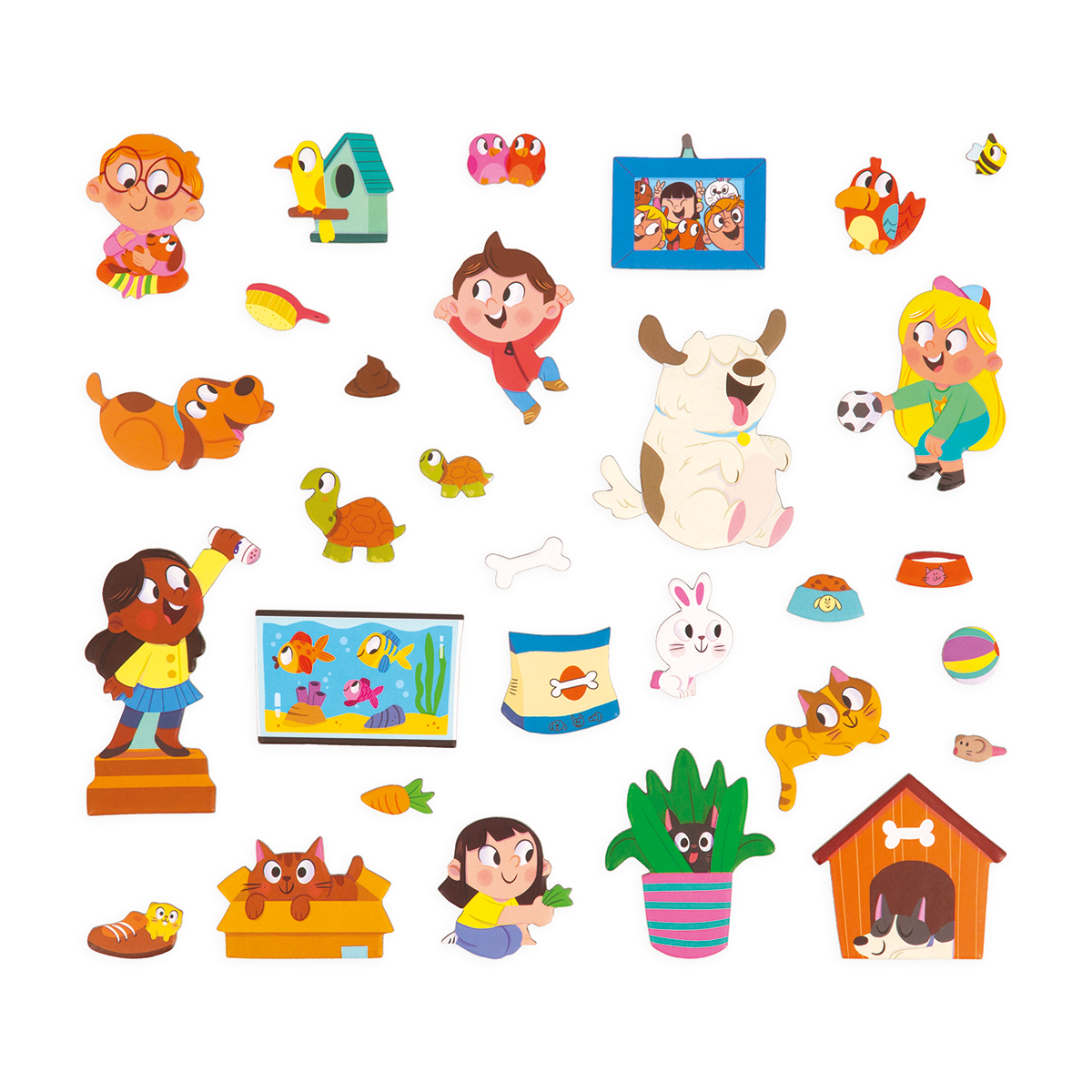 Bienvenue dans cette grande maison, remplie d'animaux dont il faut s'occuper et qui ne demandent qu'à jouer ! Il faut jouer au ballon avec le chien, nourrir les poissons, et ne pas perdre de vue le hamster qui adore se cacher dans les chaussures ! Avec un grand décor magnétique et 30 magnets votre enfant a tout le nécessaire pour imaginer de grandes histoires. Jouet magnétique en carton FSCTM. Jouet pour les enfants à partir de 3 ans.