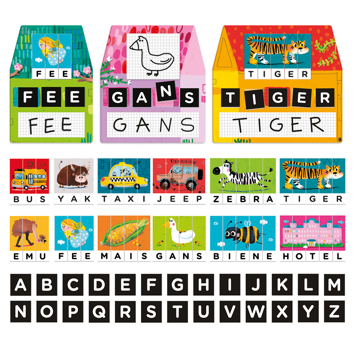 Je lis et écris avec trois méthodes amusantes! Avec les maisons spéciales, les enfants assemblent les puzzles de mots, écrivent avec les lettres et s'exercent à l'écriture libre. Le jeu, inspiré de la méthode Montessori des trois temps, renforce l'apprentissage de la lecture et de l'écriture. Apprendre à écrire, lire des mots, reconnaître l'alphabet, élargir le vocabulaire, développer la compétence. Contenu: 72 lettres, 3 maisons pour assembler des mots, 12 puzzles, 3 tableaux d'écriture pour écrire et effacer, marqueur pour écrire et effacer, instructions.