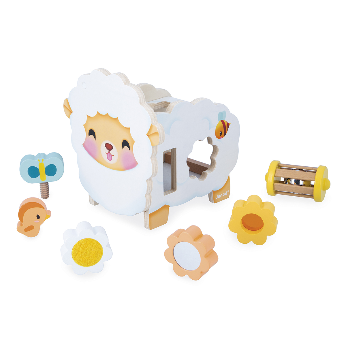 Voici le plus mignon des moutons Janod ! Il s'accompagne de 6 accessoires qui se rangent sur et dans le mouton. Le petit oiseau est magnétique et vient se nicher sur la tête. Sur son dos, on peut y mettre le hochet et le papillon qui se visse. Les fleurs s'encastrent sur les côtés et bébé y découvrira un miroir, une partie à gratter et un plexi transparent pour voir la vie en orange. Développe la motricité fine et l'imagination des enfants. Jouet en bois. Jouet d'éveil pour les enfants à partir de 12 mois.