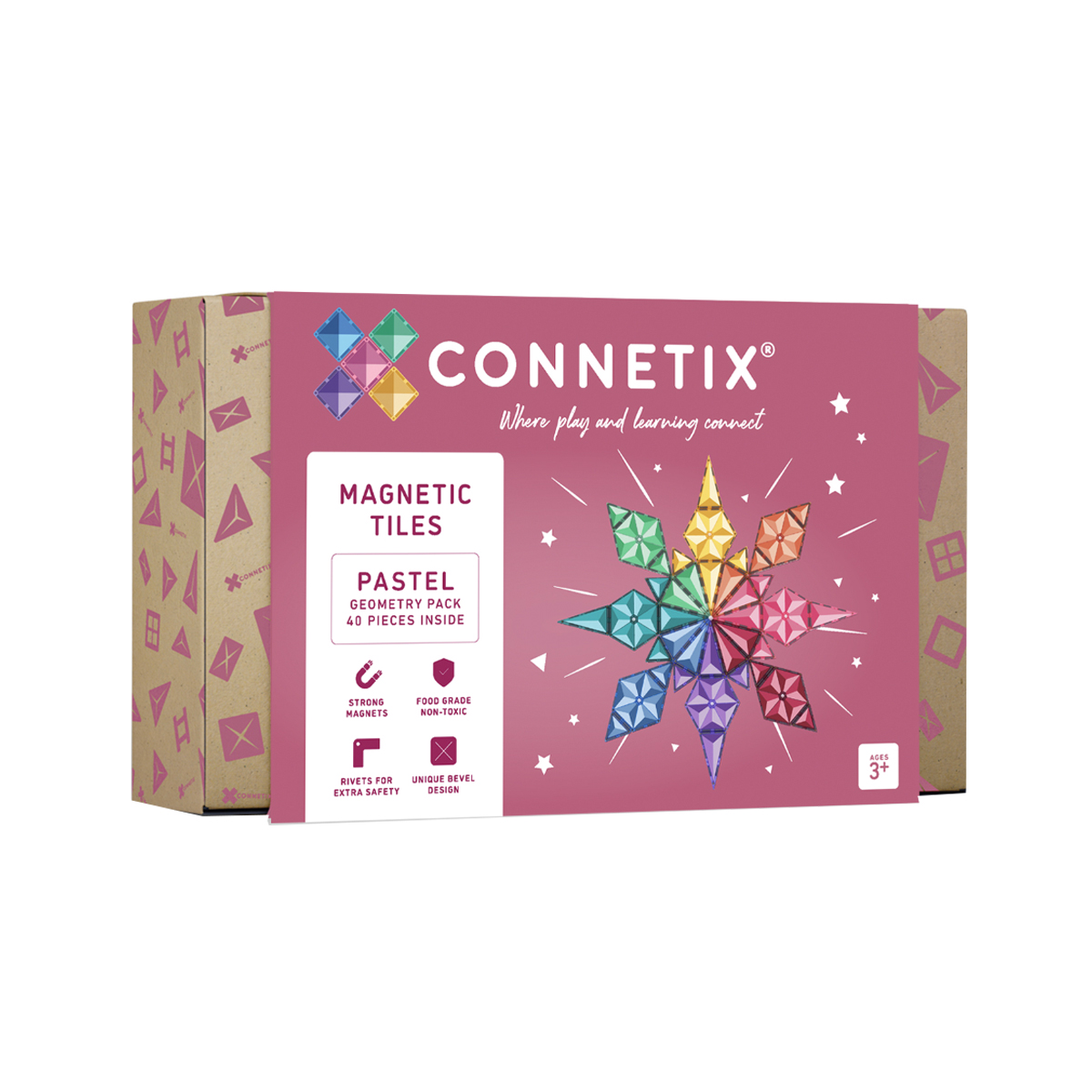 Encouragez la découverte passionnante des concepts géométriques tels que les formes, les lignes, les angles, les dimensions, les fractions, les formes 2D et 3D, ainsi que des concepts scientifiques et technologiques comme le magnétisme et les couleurs – tout cela par le jeu! Cet ensemble d'hexagones et de triangles aux 8 couleurs pastel uniques complète parfaitement votre collection Connetix et vous permet de créer des motifs, des pyramides, des dodécagones, des mandalas et bien plus encore. Enrichissez votre collection avec nos hexagones et triangles pastel et découvrez une multitude de possibilités! Connetix est un jouet polyvalent et de haute qualité qui évolue avec votre enfant et devient de plus en plus complexe. Multipliez les possibilités de jeu et d'apprentissage avec les blocs de construction magnétiques en combinant votre ensemble Géométrie Pastel de 40 pièces avec l'ensemble Créatif Pastel de 120 pièces ou le Méga Ensemble Pastel de 202 pièces pour une expérience de jeu magnétique encore plus enrichissante.