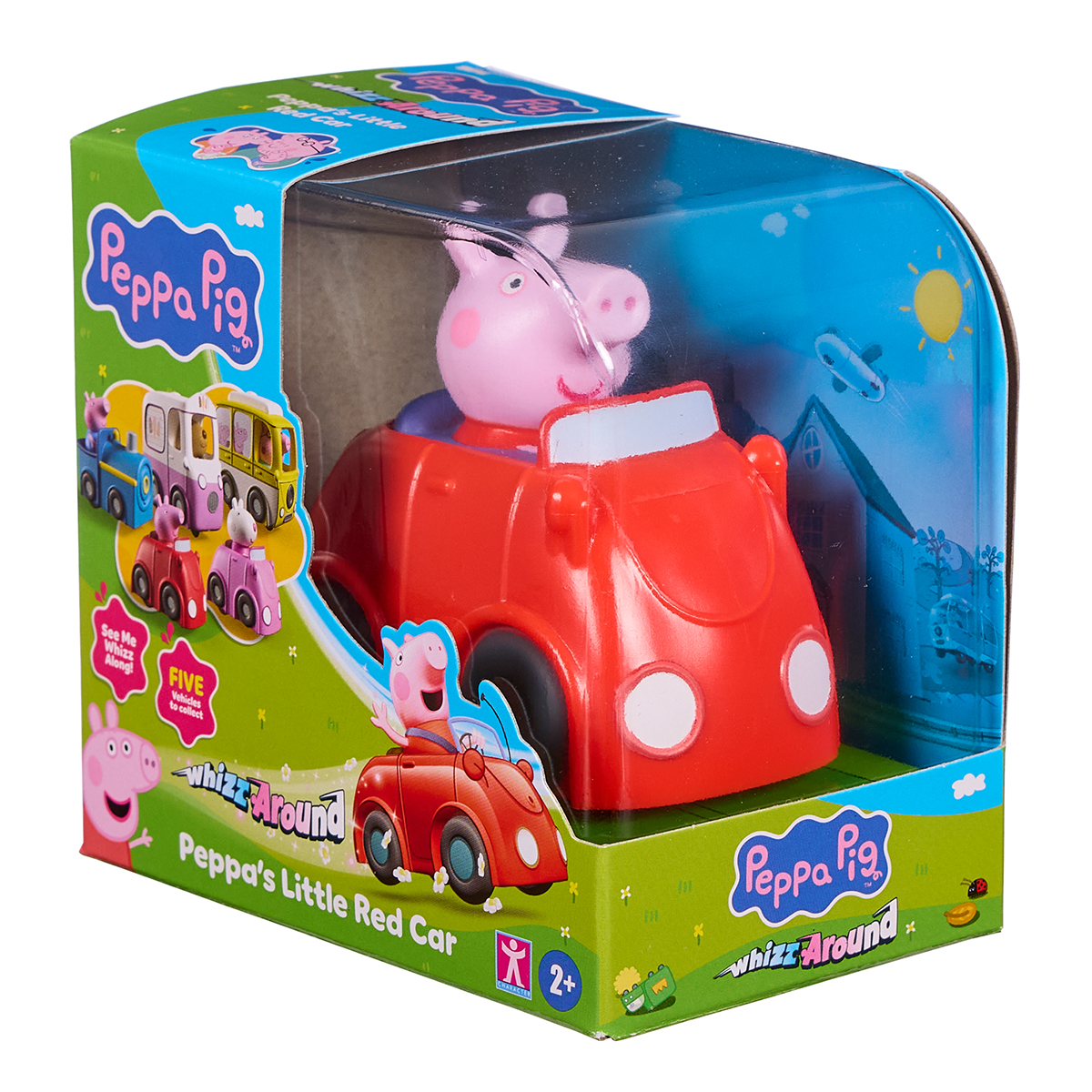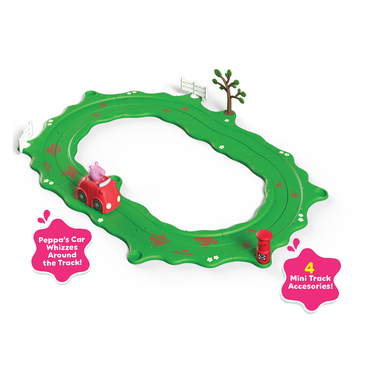 Peppa Pig Whizz Around est une nouvelle gamme passionnante de jouets Peppa Pig, spécia-lement conçue pour les enfants d'âge préscolaire. Contenu : 8 pièces de rail, petite voiture rouge, marchand de glaces, 2 arbres, boîte aux lettres, clôture blanche