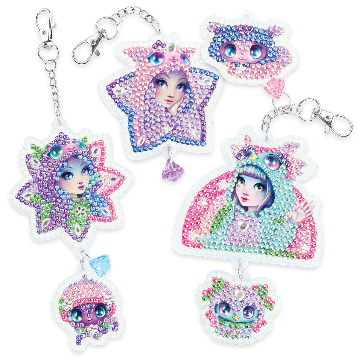 Créez 3 porte-clés magnifiques qui ne servent pas qu'à accrocher vos clés ! Décorez votre sac à main, votre sac à dos ou votre gourde. Leur fabrication est un vrai plaisir : il suffit de placer les strass scintillants sur les supports adhésifs et d'admirer leur éclat (voir le nuancier) ! Le kit comprend 6 bases en acrylique prêtes à décorer, 3 crochets pour porte-clés, 3 perles colorées, 12 anneaux, plus de 2 000 strass, un applicateur pour strass, un plateau à strass et un carré de cire.