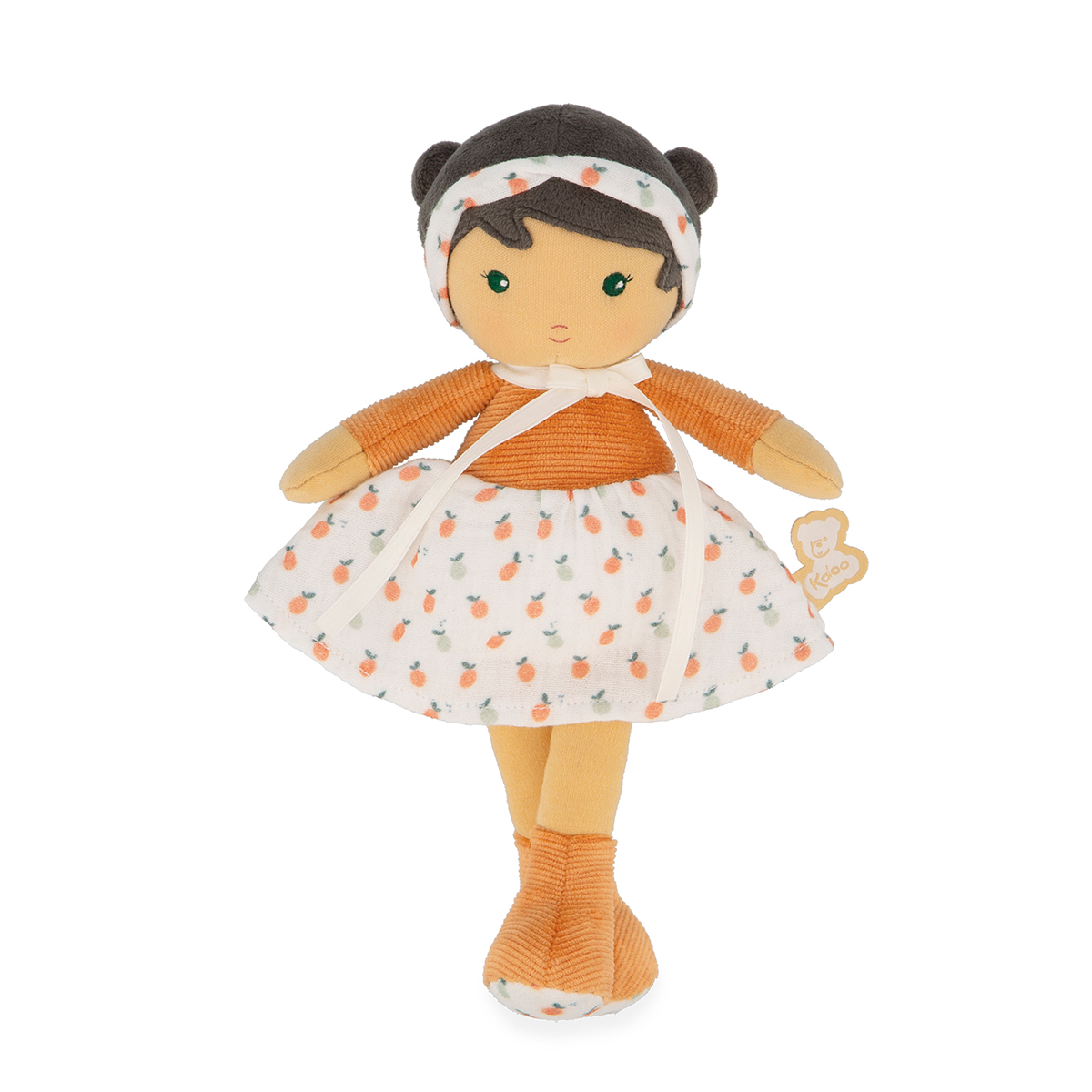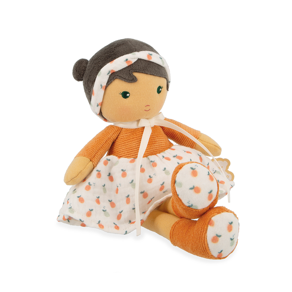 Découvrez Éloïse, une charmante poupée en tissu de 25 cm. Elle porte une jupe à motifs fruités, qui évoque la douceur de l'été et les cueillettes ensoleillées. Son haut est élégant, tandis que ses bottines lui assurent confort et allure champêtre. Un délicat bandeau mettant en évidence ses doubles chignons plein de malice est assorti à sa jupe. Éloïse incarne la douceur des journées à la campagne, entre promenades bucoliques et rêveries sous les pommiers. Dans son dos, on retrouve un joli ruban sur lequel on peut inscrire le prénom de bébé. La petite taille de cette poupée lui permettra d'accompagner bébé partout. La poupée Éloïse a une robe en velours côtelé et mousseline. Lavable en machine à 30°C. Au moins 80% de matières rembourrage recyclés. Dès la naissance.