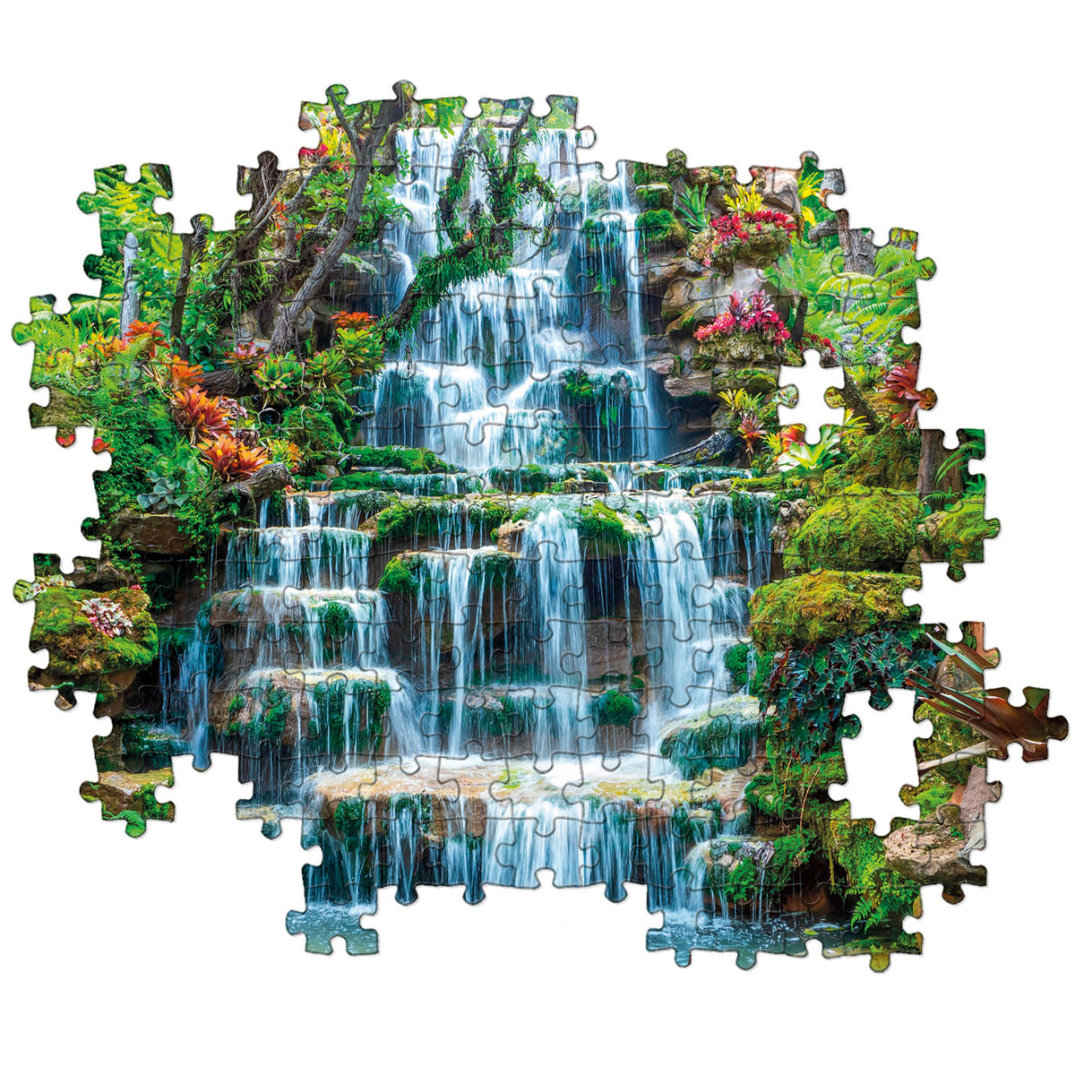 Beau puzzle Peace High Quality d'une cascade d'eau idyllique dans un nature verte fleurissante. Composé de 500 pièces.