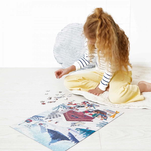 Quel est votre moment préféré après une journée passée à skier ? Ce puzzle de 500 pièces fait la part belle à tous les incontournables d’un après-ski réussi : une bonne fondue au fromage, un chocolat chaud au coin du feu, une couverture confortable, des amis … Et une vue à couper le souffle sur les montagnes enneigées ! Idéal pour les enfants à partir de 8 ans, et pour toute la famille, ce puzzle sur le thème des sports d’hiver vous rappelle à vos bons souvenirs comme à ceux que vous créerez en l’assemblant. Le grand nombre et la taille des pièces font de ce puzzle un vrai challenge où minutie et dextérité seront essentielles pour reproduire la belle illustration. Installez-vous confortablement et profitez de votre soirée puzzle pour vous détendre avec une activité ludique et reposante ! Il n’y a rien de mieux après l’effort. Que vous soyez plus à l’aise au chalet comme dans la poudreuse, sur des skis comme sur une luge, le thème hivernal de ce puzzle vous transportera dans un paysage enchanteur. Se dépasser sur les pistes, déguster des spécialités locales, partager des moments conviviaux en famille ou entre amis : voilà les bons ingrédients pour des vacances d’hiver mémorables ! Une fois assemblé, ce puzzle de 34x48 cm sera un très bel objet à encadrer. Composé de carton et de papier issus de forêts gérées durablement, ce puzzle est certifié FSC™. Fabriqué en Pologne, il est décoré d’encres végétales. Alors, fartez vos skis !