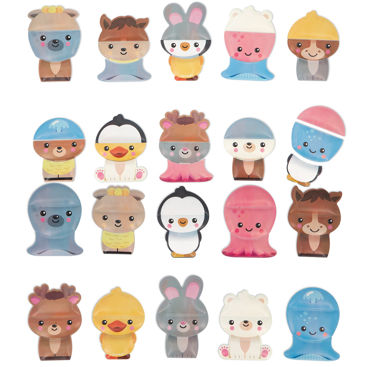 Une tête de lapin, des yeux de canard, et un corps de manchot, qui suis-je? Partagez un moment de rire et de découverte, avec ce joli set de bain. Composé de 30 pièces, ce set de mix et match permet de mixer à l'infini 10 animaux, pour des rendus tous plus rigolos les uns que les autres! Magique, trempez les pièces dans l’eau, elles flottent et tiennent sur la faïence! Jouet pour le bain idéal pour les enfants à partir de 2 ans.