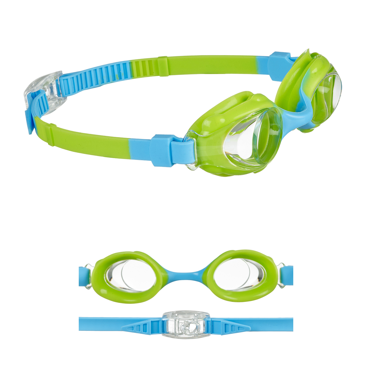 Lunettes de natation unibody souples pour les enfants à partir de 4 ans. Mise en place facile des lunettes grâce à la fermeture rapide déclipsable. Protection UV et antibuée. Mono bandeau avec clip de réglage. Lentilles en polycarbonate, joint, cadre et bandeau en silicone.