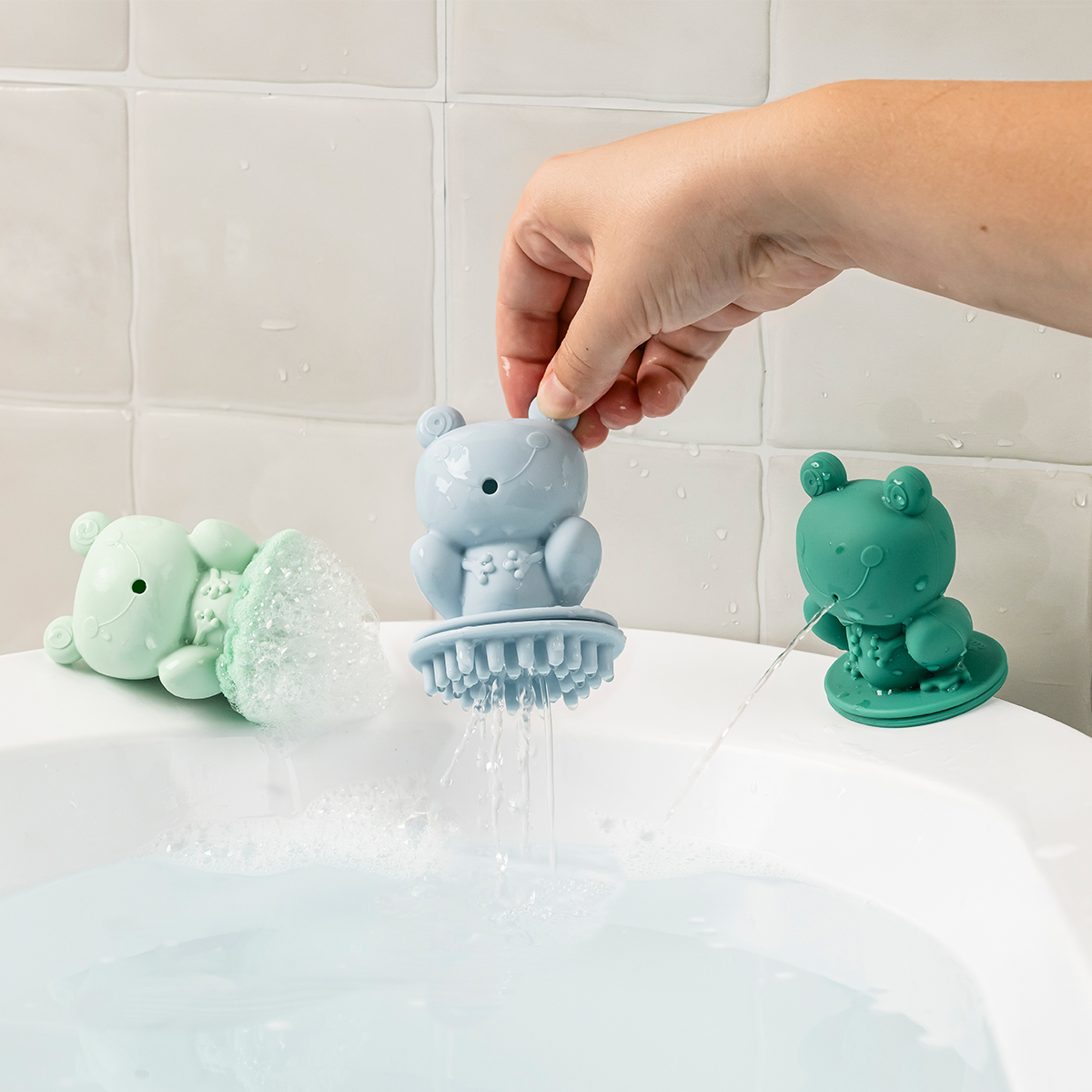 Un trio de grenouilles pour un moment de bain joyeux ! Ces grenouilles transforment le bain en un moment plein de découvertes : la première masse doucement avec ses picots en silicone souples, la deuxième projette des jets d'eau amusants lorsque l'on appuie sur sa tête, et la troisième surprend les petits en faisant de la mousse lorsqu'on souffle dans sa bouche.