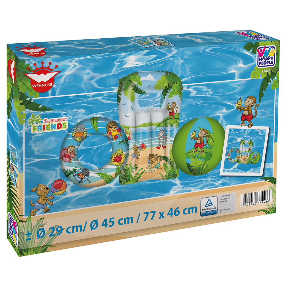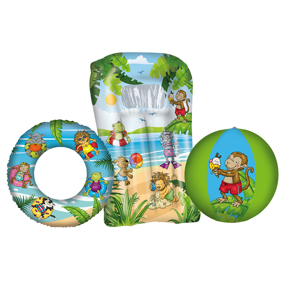 Set de plage 3pcs. contenu: ballon gonflable, bouée de natation et matelas pour des enfants.