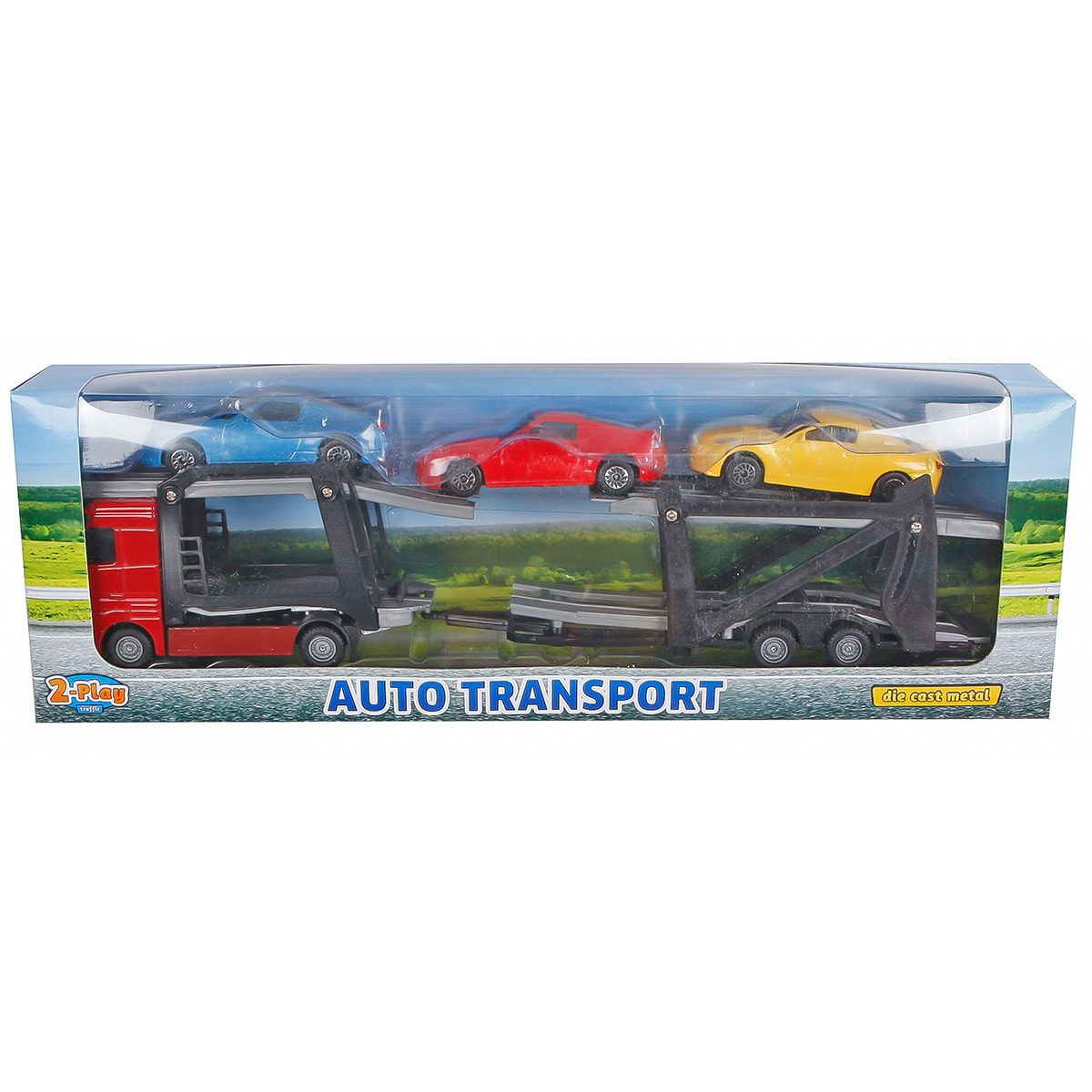 Ce transporteur Die Cast pratique à l'échelle 1:60 est fourni avec trois voitures colorées.