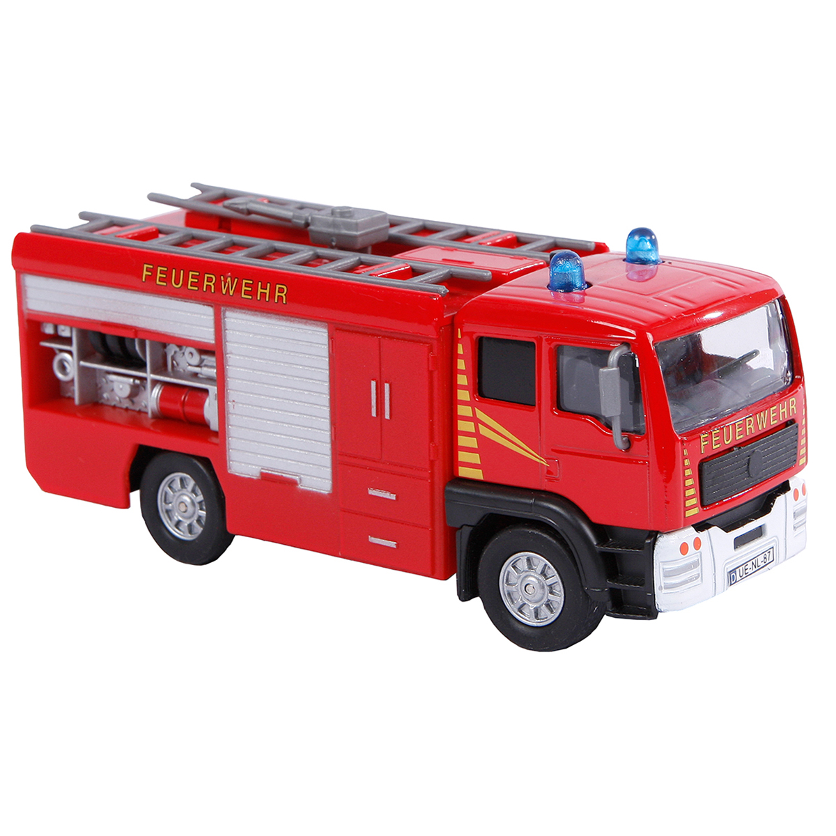 Feu s'est déclaré, les pompiers se dépêche avec lumière clignotante et sirène au lieu de l'accident. Camion de pompier avec fonction pull-back. L'emballage a une "Try me" fonction.
